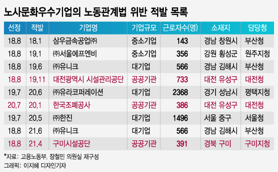 노사문화우수기업으로 선정된 일반 기업 중에서도 삼우금속공업은 2018년 8월 노사문화우수기업으로 선정됐으나 선정 후 2개월만에 노동관계법 위반이 무려 7건이나 무더기로 적발됐다. 경남 김해 소재기업 유니크는 2018년 8월 노사문화우수기업으로 선정. 그러나 2019년 10월 파견법 위반에 이어 올해 6월에도 근로기준법을 위반한 사례가 발견됐다.