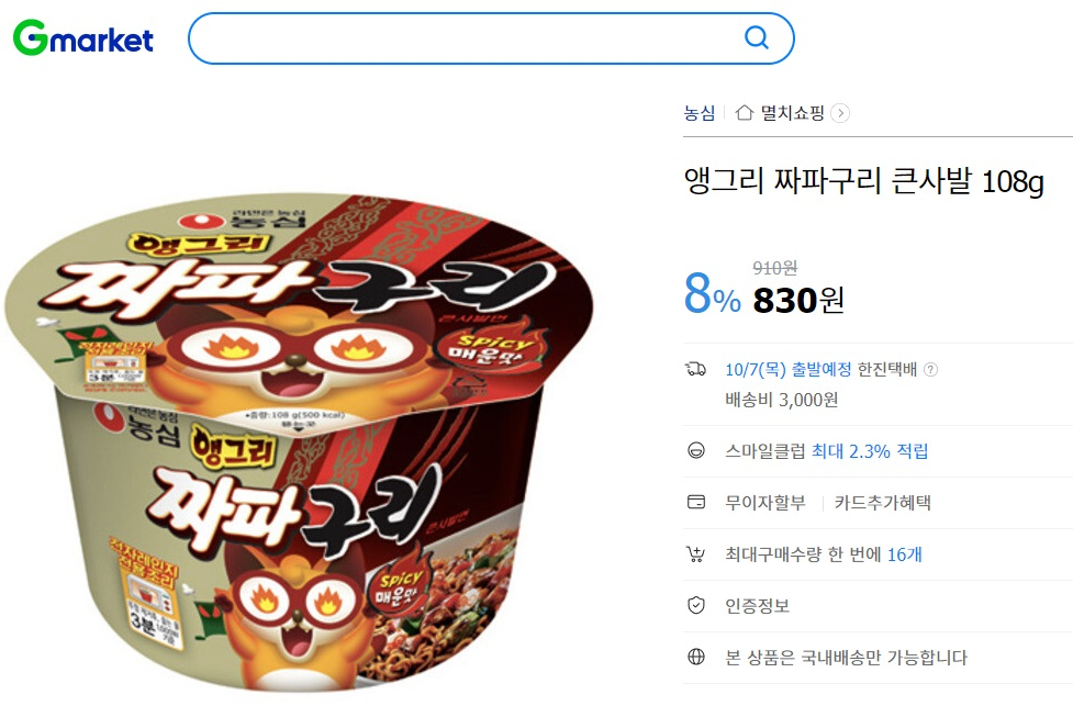 머니투데이 더300(the300)이 인터넷 쇼핑몰을 검색한 결과 G마켓에서는 앵그리짜파구리가 최대 구매수량 16개에 830원에 판매되는 경우도 있었다.