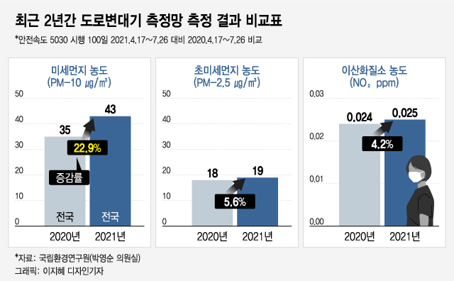 이러한 추세는 '전국 도시대기 측정망 측정 결과'에서도 확인됐다. 이 기간 전국 미세먼지 농도는 22.6%, 초미세먼지는 6.3% 증가했다.