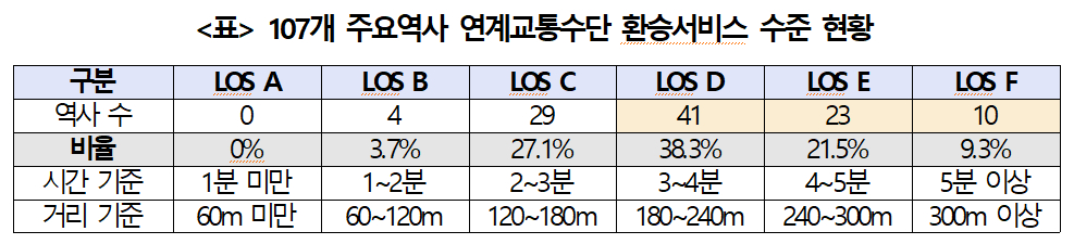 특히 철도역의 승강장에서 다른 교통수단으로 환승하는 데 5분 이상 걸리는 LOS F등급 철도역은 총 10개로 전체 107개 역사 중 9.3%를 차지했으며, 환승시간이 4분 이상 5분 이하 소요되는 LOS E등급 철도역은 총 23개로 21.5%를 차지했다. 107개 역사 중 등급별로는 LOS D등급 역사가 총 41개(38.3%)로 가장 많았다.