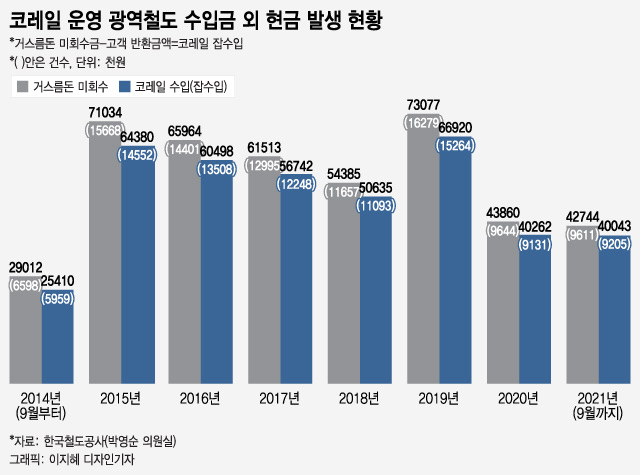 12일 국회 국토교통위원회 소속 박영순 더불어민주당 의원이 한국철도공사로부터 제출받은 '수입금 외 현금 관리실태' 자료를 분석한 결과 2014년 9월부터 2021년 9월까지 7년 동안 광역철도역에서 발생한 거스름돈 미회수금은 9만6853건에 4억4158만원이었고 이중 고객이 찾아간 돈은 6.0%인 5893건 3669만원(8.31%)에 불과한 것으로 나타났다.