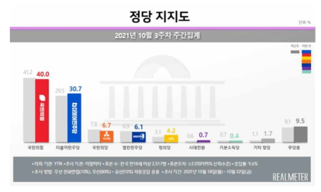 문재인 대통령의 국정수행에 대한 긍정평가가 40%로 나타났다. 정당 지지도는 국민의힘 40%, 더불어민주당 30%로 10%p 격차로 집계됐다.
