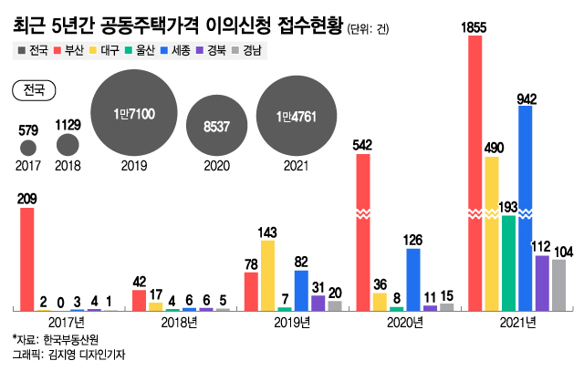 9일 국회 국토교통위원회 소속 박성민 국민의힘 의원이 한국부동산원으로부터 제출받은 공동주택가격 이의신청 접수 현황에 따르면, 2021년 접수 건수는 1만4761건으로 지난해 8537건보다 2배 가까이 늘어난 것으로 집계됐다.