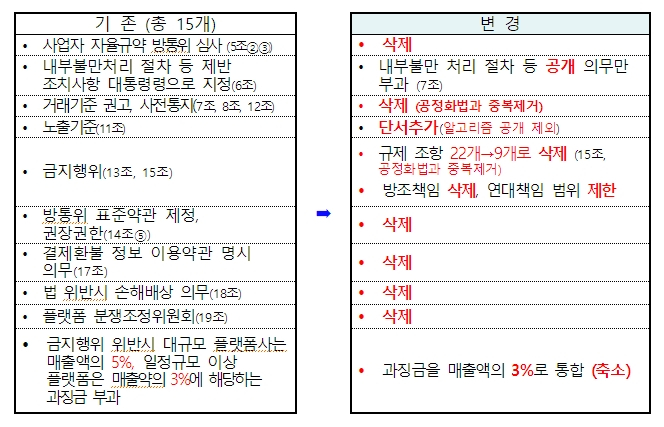방통위의 사업자 자율규약 방통위 심사, 방통위 표준약관 제정 및 권장 권한, 결제환불 정보 이용약관 명시 의무, 법 위반 시 손해배상 의무, 플랫폼 분쟁조정위원회 등 조항을 삭제했다. 온플 공정화법에서 규정하는 거래기준 권고와 사전 통지 조항도 빠졌다.