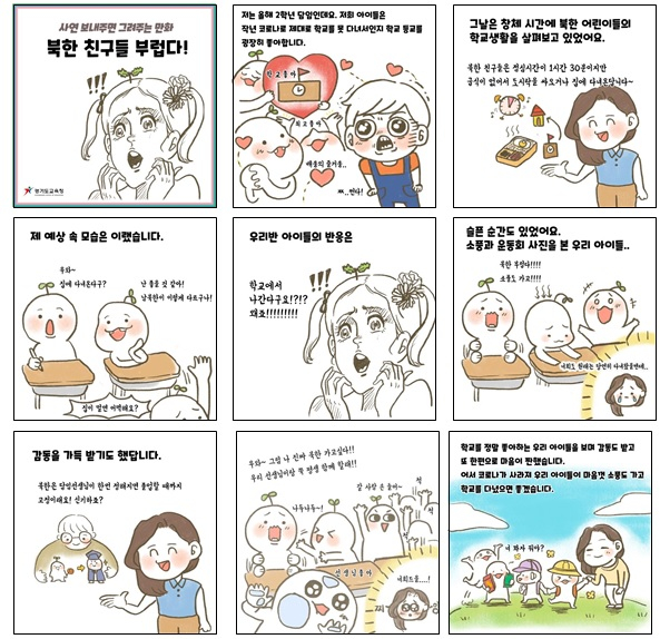 1일 머니투데이 더300(the300)이 조명희 국민의힘 의원을 통해 확보한 문건에 따르면 경기도교육청은 북한 찬양 웹툰 논란과 관련한 사연 원문을 조 의원에게 전달했다. 초등학교 담임이 작성해 경기도교육청이 채택한 사연 원문에는 "통일교육주간이라 '창체'('창의적체험활동') 시간에 어떤 수업을 할까 하다가 통일교육원 자료 중에 북한 친구들의 학교생활 모습을 살펴보는 내용이 있어 함께 알아보았어요"라는 문구가 나온다.