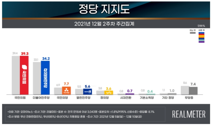 정당 지지도에선 국민의힘 39.3%, 민주당 34.2%로 나타났다. 국민의힘은 0.1%p 떨어졌고, 민주당은 1.1%p 올랐다. 두 정당 간 격차는 6.3%p에서 5.1%p로 좁혀졌다. 오차범위 밖이다.