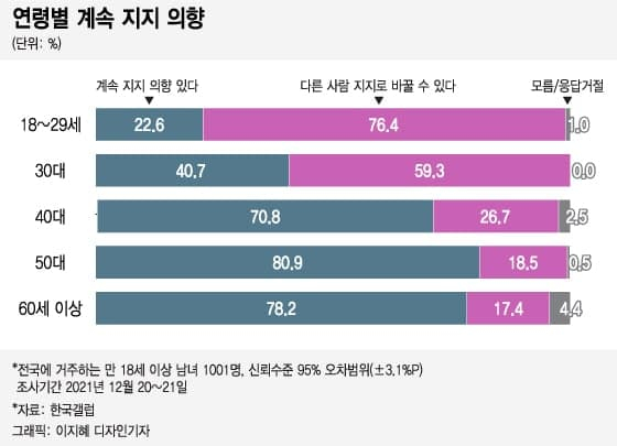 20대는 '반드시 투표하겠다'는 응답도 63.3%로 80%대인 다른 연령층에 비해 가장 낮았다. 그나마 지지 후보를 밝힌 이들 중에서도 '계속 지지할 것 같다'는 응답은 22.6%에 그쳐 이 역시 전 연령대에서 가장 떨어졌다.