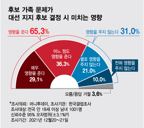'후보 가족 문제가 대선 지지 후보를 결정하는데 얼마나 영향을 준다고 생각하느냐'는 질문에 65.3%가 매우 영향을 주거나 어느 정도 영향을 준다고 답했다. 영향을 미치지 않는다는 답변 31%의 두배 이상 많은 수치다. '모름/응답 거절'은 3.6%다.