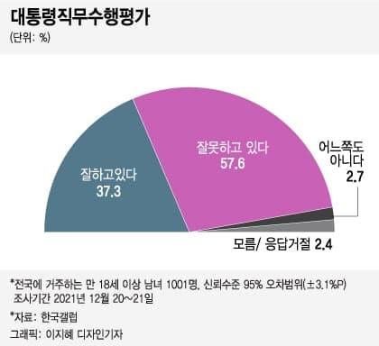 문재인 대통령의 직무수행에 대해선 '잘못하고 있다'는 응답은 57.6%로 나타났다. '잘하고 있다'는 응답은 37.3%로 부정평가 대비 20.3% 낮은 수치다.