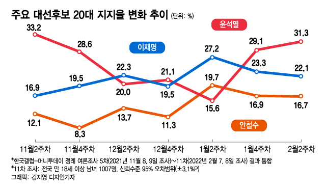 올 초 선대위 내홍에 휩싸인 윤 후보의 지지율이 크게 떨어졌다가 '이대남'(20대 남성)을 겨냥한 여성가족부 폐지 공약 등으로 급반등한 게 대표 사례다. 안철수 국민의당 후보가 1월 5일 조사에서 처음으로 두자릿 수 지지율을 기록할 때도 20대 지지율 상승이 원동력이 됐다.