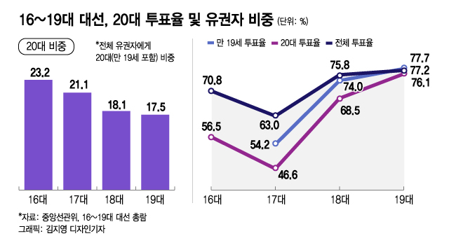 지난 네 차례 대선에서 전체 유권자 중 20대(만 19세 포함) 비중은 점차 줄어들었다. 16대 23.2%, 17대 21.1%, 18대 18.1%, 19대 17.5%였다. 비중 감소에도 20대 유권자들의 존재감이 커진 이유는 투표율이 크게 높아졌기 때문이다. 16~19대 대선의 20대 투표율은 56.5%→46.6%→68.5%→76.1%, 17대부터 투표권이 주어진 19세의 경우 54.2%→74%→77.7%로 높아졌다. 박근혜 전 대통령의 탄핵 여파로 치러진 지난 대선에선 3040세대보다 높은 투표율을 기록했다.