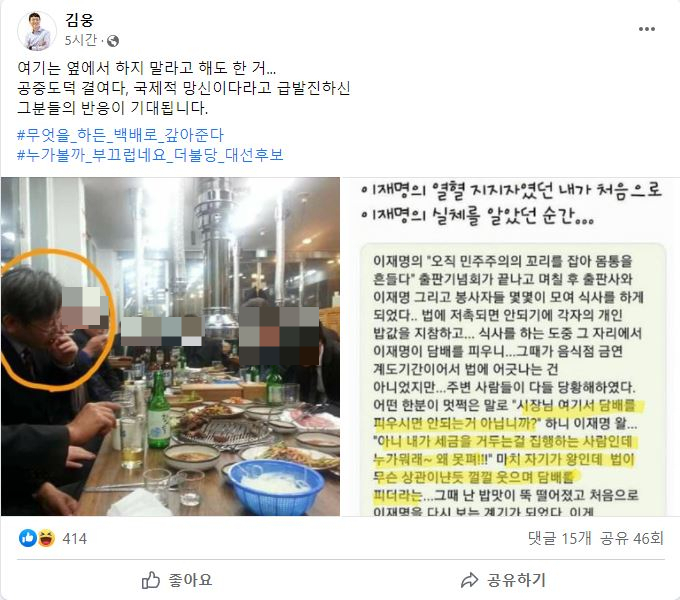 이날 국민의힘 일부 의원들은 페이스북에 '이재명의 실체를 알았던 순간'이라는 누리꾼의 글을 공유했다. 해당 게시물에 따르면 이 후보는 실내에서 흡연을 하며 '여기서 담배를 피우면 안 되는 거 아닌가'라는 주위 사람의 만류에 "내가 세금을 거두는 걸 집행하는 사람인데 누가 뭐라고 하냐"고 대응했다. 이 글과 함께 이 후보가 식당에서 담배를 피는 사진도 공개됐다.