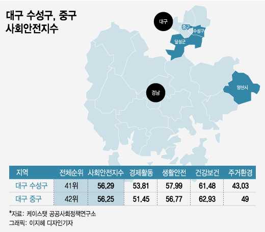 정진우 케이스탯 이사는 "수성구와 중구 모두 주민들의 설문조사가 실제 정량지표보다 높았다는 특징이 있다"라며 "수성구의 경우 '대구의 강남'이라는 생활 수준이 높다는 자부심, 중구는 주요기관들이 자리해 있고 원도심에 살고 있다는 심리가 작용했다고 볼 수 있다"고 분석했다.