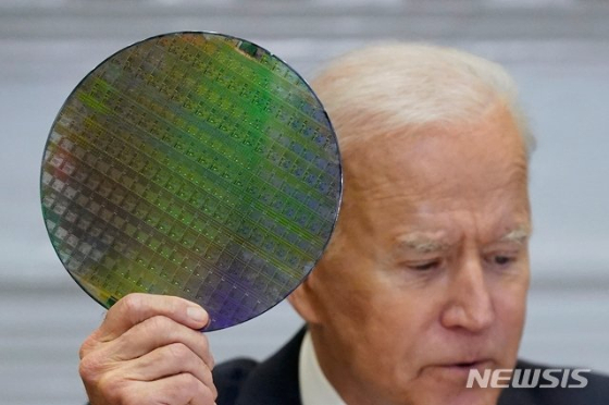 ![12일(현지시간) 미국 워싱턴 백악관 루즈벨트룸에서 열린 반도체 공급망 관련 회의에서 조 바이든 대통령이 반도체 웨이퍼를 들어보이고 있다./사진제공=[워싱턴=AP/뉴시스]](https://thumb.mt.co.kr/cdn-cgi/image/f=avif/21/2022/03/2022032914024061493_1.jpg)