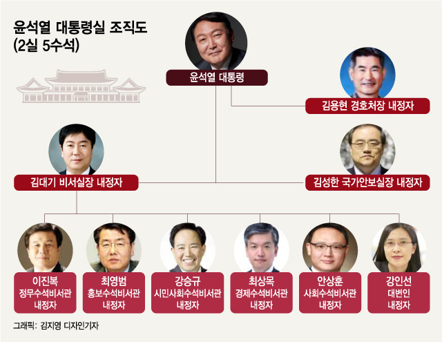경호처장은 일찌감치 내정된 김용현 전 합동참모본부 작전본부장이다. 장 실장은 "(그동안) 행정부가 청와대의 뜻을 집행하는 기관에 머물렀다. 그래서 좀 더 창의적이고 혁신적인 정책들을 집행하고 수립할 수 있도록 대통령실은 조율하는 역할을 충실히 하겠다는 차원에서 슬림화했다"고 설명했다.