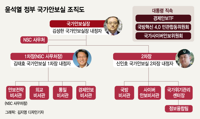 김성한 전 외교부 차관과 국가안보실에서 호흡을 맞추게 될 1차장과 2차장은 김태효 전 청와대 대외전략기획관, 신인호 전 청와대 위기관리비서관이 각각 이름을 올렸다. 기존 1차장이 국방, 2차장이 외교 담당으로 편제됐지만 이번에 역할이 교체됐다.