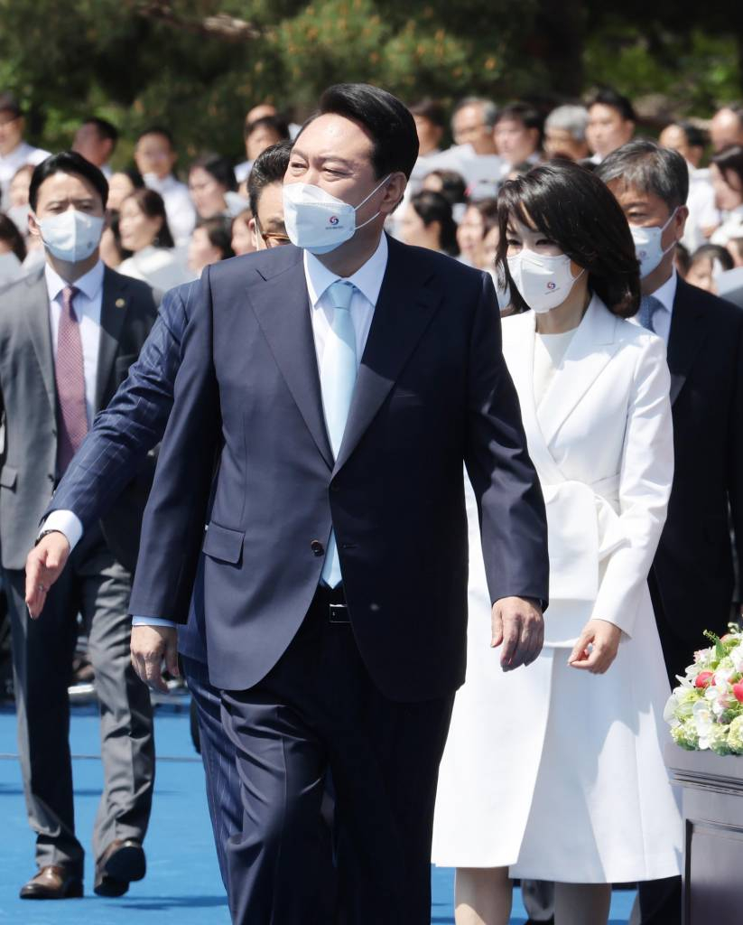 ![[서울=뉴시스] 홍효식 기자 = 윤석열 대통령과 부인 김건희 여사가 10일 오전 서울 여의도 국회 앞마당에서 열린 제20대 대통령 취임식에 참석하고 있다. 2022.05.10.](https://thumb.mt.co.kr/cdn-cgi/image/f=avif/21/2022/05/2022051011225043691_1.jpg)