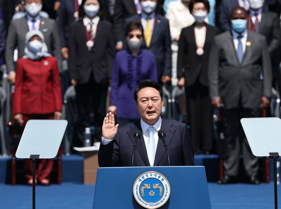 이어진 취임사에서 윤 대통령은 국정 운영의 핵심 가치를 '자유'라는 키워드에 함축해 풀어냈다. 윤 대통령은 '자유'를 35차례 언급하면서 "자유, 인권, 공정, 연대의 가치를 기반으로 국민이 진정한 주인인 나라, 국제사회에서 책임을 다하고 존경받는 나라를 위대한 국민 여러분과 함께 반드시 만들어 나가겠다"고 밝혔다. 취임사 한 문장이 끝날 때마다 박수와 환호가 이어졌다.