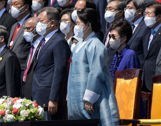 단상 중앙 가운데쪽에는 윤 대통령 부부와 문재인 전 대통령 부부가 나란히 앉았다. 박 전 대통령은 문 전 대통령의 오른팔 뒤쪽 방향에 자리가 마련됐다. 박 전 대통령(제18대), 문 전 대통령(19대), 윤 대통령(20대)까지 전현직 대통령이 나란히 자리한 셈이다.
