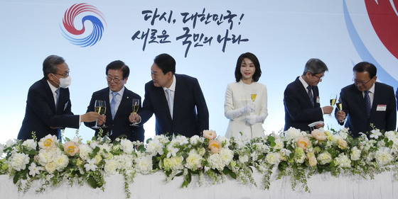 윤 대통령은 5부 요인 등과 함께 한 이날 연회에서 "오늘은 새 정부가 출범하는 기쁜 날입니다마는 대통령에 취임하는 저 윤석열이라는 개인의 정치적 승리의 날도 아니고 제가 몸담고 있는 국민의힘이라는 정당의 승리의 날도 아니다"며 이같이 말했다.