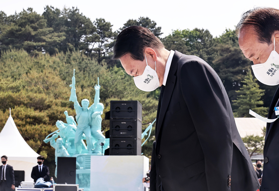 윤 대통령은 "취임 후 첫 국가기념일이자 첫 지역 방문"이라며 "우리는 민주 영령들께서 잠들어 계시는 이곳에 숙연한 마음으로 섰다. 고귀한 희생에 경의를 표하며 머리 숙여 명복을 빈다"고 말했다.