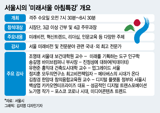 '미래서울 아침특강'은 시 간부 및 직원들이 학습하는 자리다. 주제도 시정과 관련된 것들이 대부분이다. 4차 산업혁명과 공간혁신, 디지털 전환, 청년 등 한국 사회에 던져진 화두들을 다룬다. 이를 두고 이뤄지는 특강은 박수받을 만하다. 민간 기업이 아닌 상황에서 강연자를 구하기도 녹록지 않다. 방식도 제한적일 수밖에 없다. 마냥 자유스러운 분위기를 만들 수도 없다.