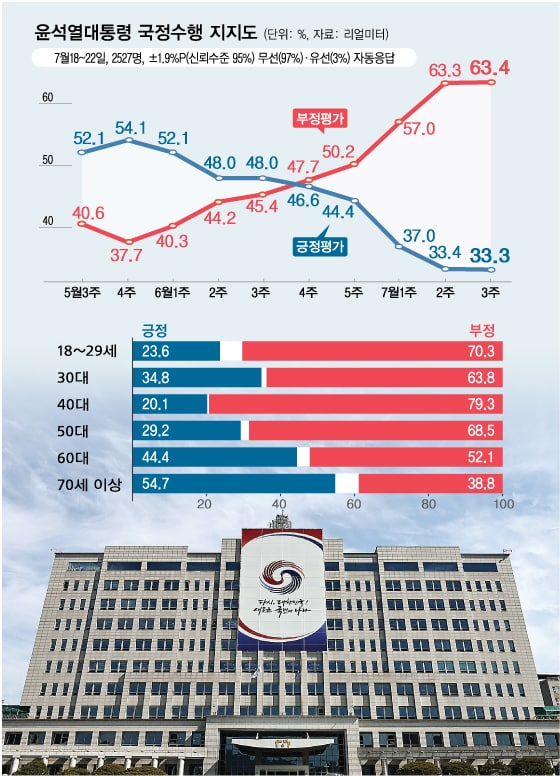 문제는 긍정적 취지의 정책을 제대로 시작도 해보지 못한 상태에서 국정 동력에 타격을 받고 있다는 점이다. 출범 100일도 안 된 새 정부가 민심 이반 우려에 직면했다. 30% 초반대로 추락한 대통령의 국정수행 지지도는 특별한 정책 실정으로 인한 게 아니라는 측면에서 대통령실 참모들이 답답함을 토로하기도 한다. 여전히 기본적 인식은 지지율에 일희일비하지 않고 국민만 바라보고 일하겠다는 것이다. 이달 초 "지지율은 의미 없다"던 윤 대통령의 발언이 이같은 맥락이다.