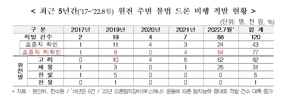 7일 국회 과학기술정보방송통신위원회 소속 이정문 더불어민주당 의원이 한수원으로부터 제출받은 '최근 5년간 원전 주변 불법비행 드론 현황'에 따르면 2017년 2건, 2019년 19건, 2020년 4건, 2021년 7건, 2022년(7월까지) 88건 등 120건이 적발된 것으로 집계됐다.