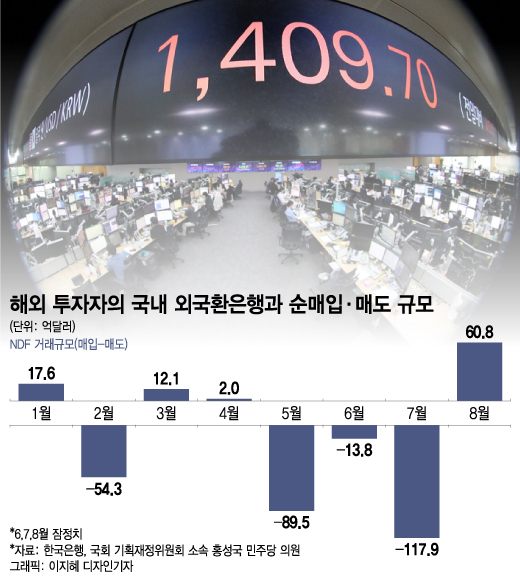 25일 국회 기획재정위원회 소속 홍성국 더불어민주당 의원이 한국은행으로부터 제출받은 '비거주자(해외 투자자)와 국내 외국환은행 간 NDF 거래 현황'에 따르면 지난달 해외 투자자의 NDF 순매입 규모가 60억8000만달러(잠정치)에 이른 것으로 파악됐다. 지난달 원/달러 환율 일평균 종가(1320.4원) 기준 약 8조300억원에 달하는 규모다.