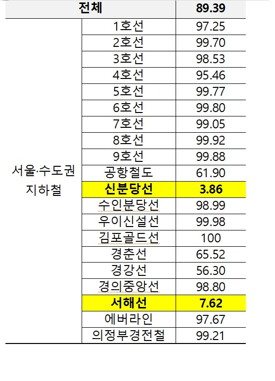 특히 개통된 지 10년이 지난 신분당선의 5G 가용률은 개통 4년차를 맞은 서해선의 절반 수준으로, 지난해 '통신서비스 품질평가 결과'에서 최하위를 기록했다. 이런 배경에는 신분당선과 통신3사 사이의 시설 투자와 사용료 협정 등이 지연된 영향이라는 게 허 의원실과 업계의 설명이다.