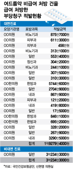 특히 비대면으로 처방했다가 부당청구로 적발된 전북의 A병원의 적발금액은 나머지 20곳의 적발금액을 모두 합한 것보다 두 배 가까이 많았다. A병원이 지난해부터 올해 5월까지 비급여로 처방했어야 할 이소티논을 비대면으로 급여 처방해 적발된 금액만 총 3억234만원이다. 나머지 20곳의 적발금액을 모두 합쳐도 1억9279만원에 그친다.