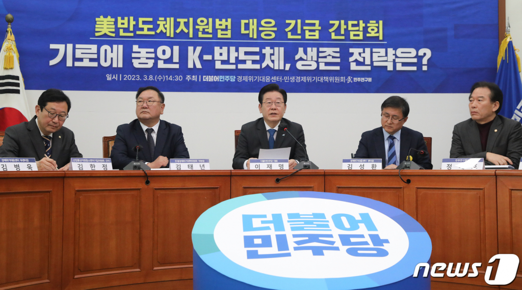 이재명 민주당 대표는 지난 8일 긴급간담회를 열어 "반도체 산업을 포함해 국가경제의 미래가 담긴 첨단산업에 대한 과감한 지원대책을 서둘러 마련해야 한다"며 "대전환 위기를 돌파할 수 있는 종합적이고 거시적인 산업 전략이 반드시 필요하다"고 강조했다.