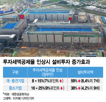 이번 간담회에서는 또 단순 세액공제율을 정하는 것 외에 업계가 요구하는 전기와 수도 등 기반시설에 대한 공공지원 확대 방안도 논의될 전망이다. 정부나 지방자치단체가 기반시설을 직접 지원하거나 관련 인·허가를 보다 쉽게 받을 수 있도록 해달란 취지다.