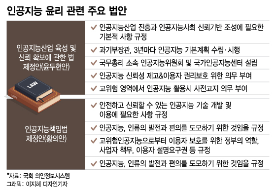 29일 정치권에 따르면 국회 과학기술정보통신위원회는 지난 2월 법안소위원회에서 윤두현 국민의힘 의원의 '인공지능산업 육성 및 신뢰 확보에 관한 법 제정안'(이하 윤두현안)을 기본 골격으로 기존에 발의된 6개 인공지능 산업 육성 법안(이상민안·양향자안·민형배안·정필모안·이용빈안·윤영찬안)을 통합한 여·야·정부 단일안(이하 단일안)을 만들었다. AI 윤리와 관련해서는 황희 더불어민주당 의원이 발의한 '인공지능책임법 제정안'(이하 황희안)도 논의되고 있다.