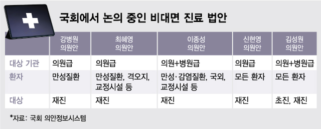 현재 국회에는 강병원·최혜영·신현영 더불어민주당 의원과 이종성 국민의힘 의원이 각각 대표발의한 법안이 발의돼있다. 네 개 법안은 재진 환자를 대상으로 비대면 진료를 허용하는 내용이다. 여기에 지난 4일 초진 환자로 대상을 넓히는 내용을 담은 김성원 국민의힘 의원의 안까지 발의돼있다.