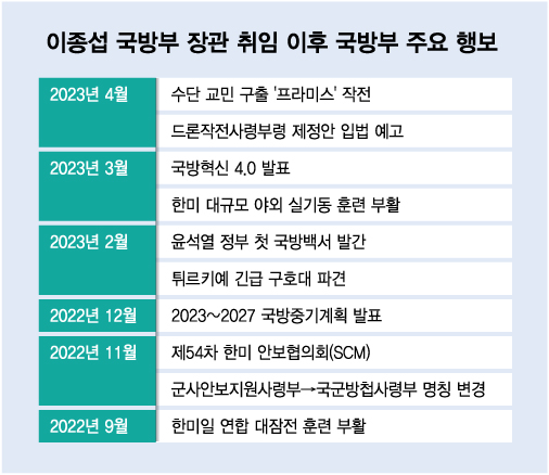 이종섭 국방부 장관은 북한의 핵 미사일 위협에 맞서 국방력 강화에 나서는 한편 '이대남(20대 남성)'들의 자랑스런 복무 여건을 조성하기 위한 병 처우 개선 등으로 분주한 1년을 보냈다. 지난달에는 내란이 격화한 수단에서 우리 국민 28명을 구출하는 '프라미스' 작전에서 군을 이끌었다.