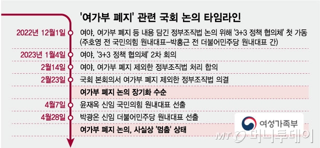 여가부 폐지 문제가 여야 간에 다뤄진 것은 지난 2월 전임 원내지도부인 주호영 전 국민의힘 원내대표와 박홍근 전 민주당 원내대표 때가 마지막이다.