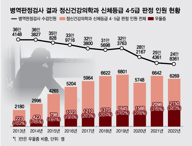 머니투데이 더300(the300)이 병무청에 요청해 2013년부터 2022년까지 실시된 병역판정검사 결과를 분석한 결과, 우울증을 사유로 신체등급 4급(보충역) 또는 5급(전시근로역) 판정을 받은 수검자 규모는 2022년 한 해 2150명에 달한 것으로 나타났다.