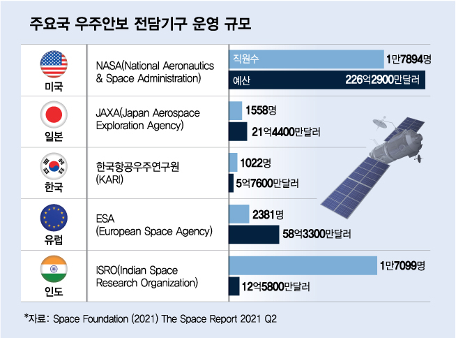 그러나 우리나라는 2040년 전까지 달에 가는 게 목표다. 미국은 이미 1969년에 한 일이다. 이 정도로 한국의 우주기술 수준은 갈 길이 멀다. 그럼에도 우주기술 개발을 주도할 국가적 컨트롤타워 설립 작업은 여야 간 이견에 발목이 잡혀있다. 미국은 NASA(항공우주국), 일본은 JAXA(우주항공연구개발기구)가 우주기술 개발을 이끌고 있다.
