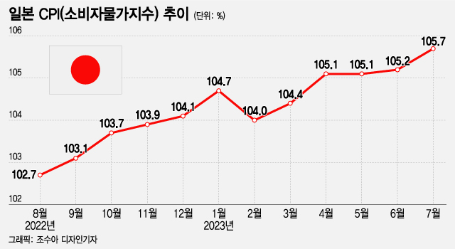 지금까지 일본 국민들은 금리가 없는 세상, 물가가 오르지 않는 세상에 익숙했습니다. 일본 유명 외식업체 요시노야의 규동과 맥도날드의 빅맥 가격이 30년 동안 오르지 않았는데 최근에 오르기 시작했습니다. 일본 젊은이들은 처음 겪는 굉장히 생경한 상황입니다. 일본의 소비자물가지수(CPI) 상승률이 올해 계속 3%대를 유지하고 있습니다. 사실 이 정도의 물가상승률은 일본에서 30년 만에 처음 있는 일입니다.