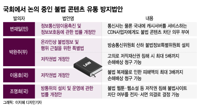 지난 7월 이용호 국민의힘 의원이 대표 발의한 저작권법 개정안은 불법 복제물을 유통하는 사업자에 대한 정부의 현장조사 근거 조항을 마련한 것이 특징이다. 또한 현장조사를 방해하면 처벌까지 가능하도록 했다. 이 밖에 이 의원 안은 △불법 복제물을 게시하거나 링크를 제공하는 사이트를 운영하는 행위를 저작권 침해 행위로 규정하고 △불법 복제물로 인한 피해액의 최대 3배까지 손해 배상액으로 청구할 수 있도록 하는 내용이 담겼다.