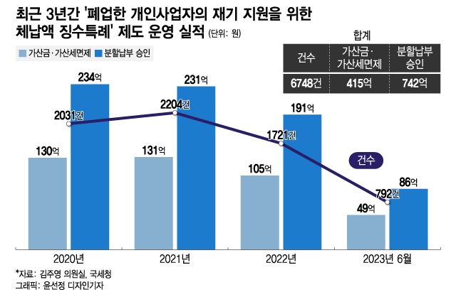 폐업한 개인사업자의 재기 지원을 위한 체납액 징수특례제도의 수혜를 받은 개인사업자 비율이 0.28%에 불과한 것으로 나타났다. 코로나19(COVID-19) 팬데믹(대유행) 여파로 폐업하는 소상공인·자영업자를 지원하기 위해 마련된 정책인데, 실제로 혜택을 본 사람이 적어 사실상 유명무실한 제도가 된 셈이다.