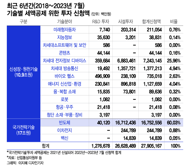 5일 국회 과학기술정보방송통신위원회 소속 이정문 더불어민주당 의원이 산업통상자원부 등으로부터 받은 자료에 따르면 최근 6년간 국내 기업이 '국가 전략기술'과 '신성장·원천기술'(원천기술) 분야 투자에 대한 세액공제를 받기 위해 정부에 신청한 전체 투자액은 약 27조9000억원이었다. 이 가운데 반도체 분야는 약 16조8000억원으로, 전체 투자액의 60%에 달했다.