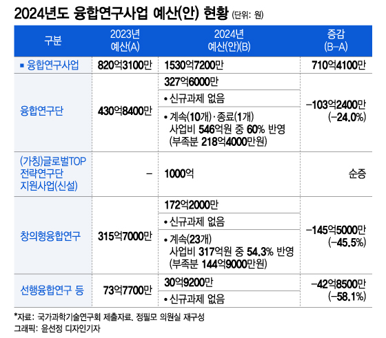 이에 따라 출연연 융합연구에 차질이 불가피해졌다. 2024년도 융합연구사업 예산안 산출 근거를 보면, 34개 융합연구과제(계속)의 사업비를 원래 계획보다 54%, 60% 수준으로 편성하도록 했다. 깎인 예산 한도에 맞추기 위해서다.