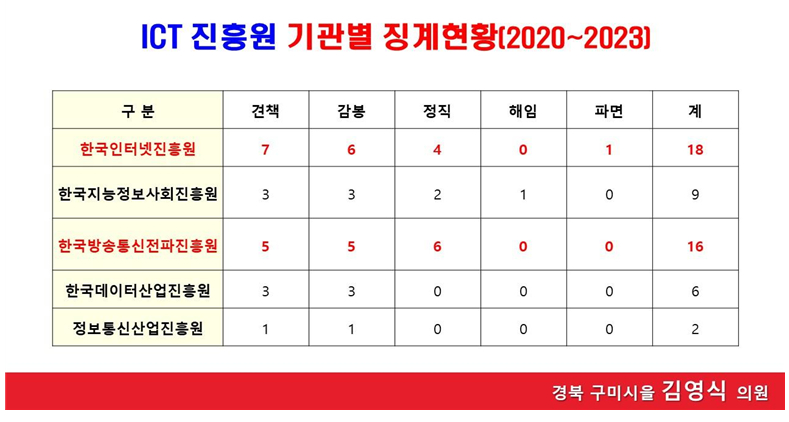 16일 국회 과학기술정보방송통신위원회 소속 김영식 국민의힘 의원실에 따르면 최근 3년간 한국인터넷진흥원(KISA) 등 국내 5개 ICT 기관에서 품위유지 및 성실 의무 위반, 직무태만 등으로 징계받은 직원은 총 51명인 것으로 확인됐다.