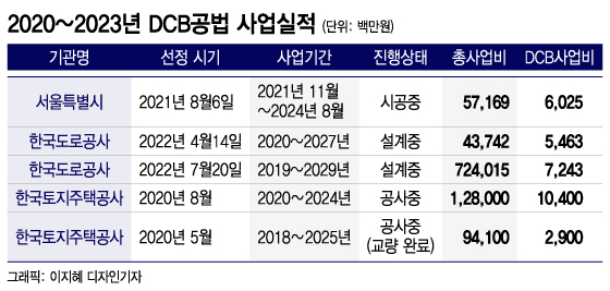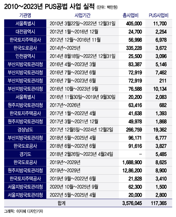구체적 사례를 살펴보면 부산지방국토관리청 5건(297억3000만원), 원주지방국토관리청 3건(114억원), 한국도로공사 3건(161억원), 한국토지주택공사 3건(117억8100만원), 서울특별시 2건(137억원), 대전광역시 1건(22억5400만원), 인천광역시 1건(30억9600만원), 경기도 1건(54억8500만원), 경상남도 1건(193억6200만원), 서울지방국토관리청 2건(430억원) 등이다.