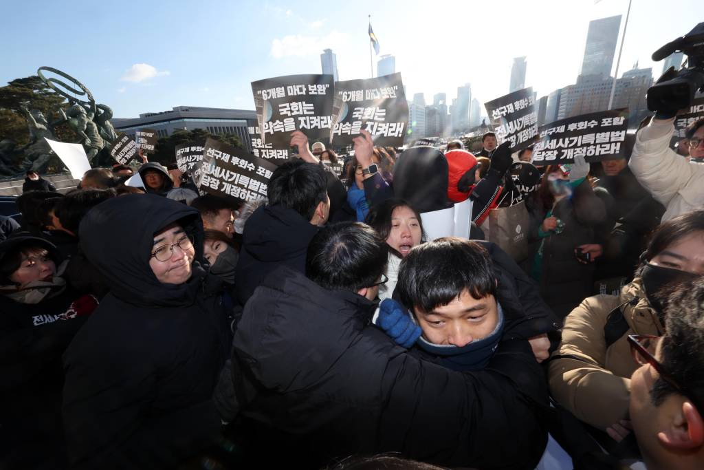 ![[서울=뉴시스] 조성봉 기자 = 전세사기·깡통전세 피해자 전국대책위원회 회원들이 21일 오전 서울 여의도 국회 본청 계단에서 기자회견을 마치고 윤재옥 국민의힘 당 대표 권한대행 겸 원내대표와의 면담을 요구하며 본청 진입시도를 하자 방호원들이 제지하고 있다. 2023.12.21.](https://thumb.mt.co.kr/cdn-cgi/image/f=avif/21/2023/12/2023122208582299447_1.jpg)