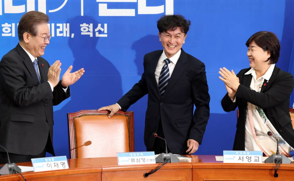 ![[서울=뉴시스] 추상철 기자 = 류삼영 전 울산중부경찰서장이 18일 오전 서울 여의도 국회에서 열린 더불어민주당 3차 인재영입식에서 이재명 당 대표로 부터 박수를 받으며 자리에 앉고 있다. 2023.12.18.](https://thumb.mt.co.kr/cdn-cgi/image/f=avif/21/2024/01/2024010716010499484_1.jpg)