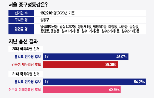 이 곳에서 내리 3선을 한 '구관' 홍익표 민주당 원내대표가 이번에는 서울 서초을에서 출마를 하기 때문에 국민의힘 윤희숙 후보와 민주당 전현희 후보 중 누가 당선돼도 중구성동갑은 '신관'을 맞이한다.