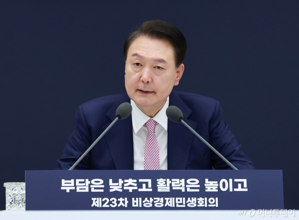 ![[서울=뉴시스] 전신 기자 = 윤석열 대통령이 27일 서울 용산 대통령실 청사에서 열린 제23차 비상경제민생회의를 주재하고 있다. (대통령실통신사진기자단) 2024.03.27. photo1006@newsis.com /사진=전신](https://thumb.mt.co.kr/cdn-cgi/image/f=avif/21/2024/03/2024032910294435647_1.jpg)